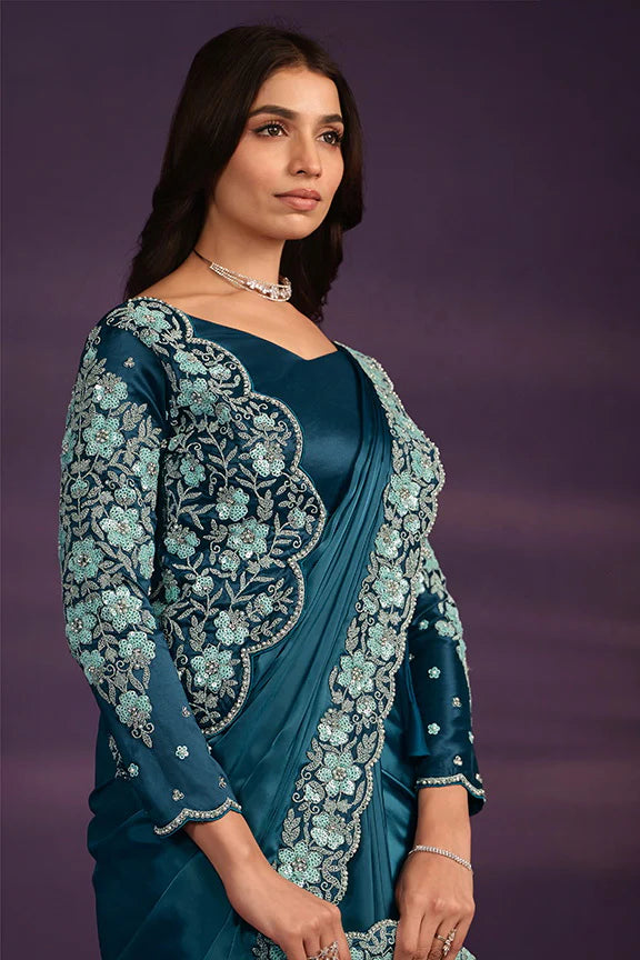 Blue Satin Silk Embroidered Ready to wear Saree with Stitched Blouse