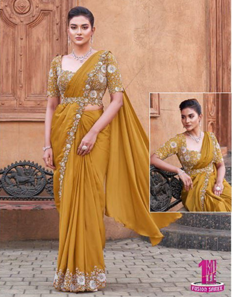 Mustard Pearl Handwork Crepe Satin Silk Ready to Wear Saree