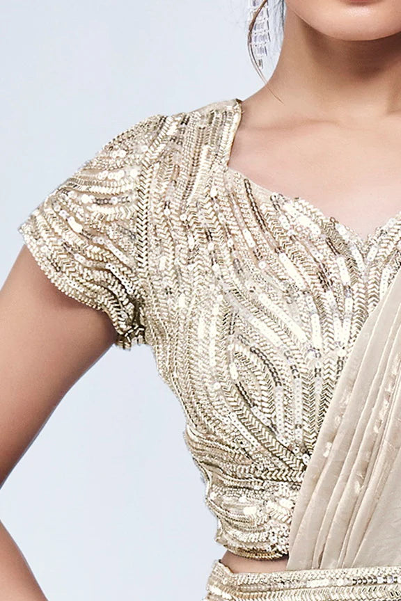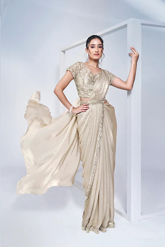 Off White Hand Work Satin Silk Ready to Wear Saree