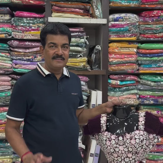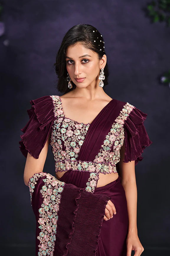 Wine Crepe Satin Silk Embroidered Ready to Wear Saree with Stitched Blouse